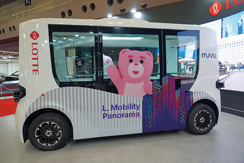 お菓子のイメージが強いロッテも自動運転のシャトルを展示していた。韓国から持ってきましたとスタッフも意気込んでいた。